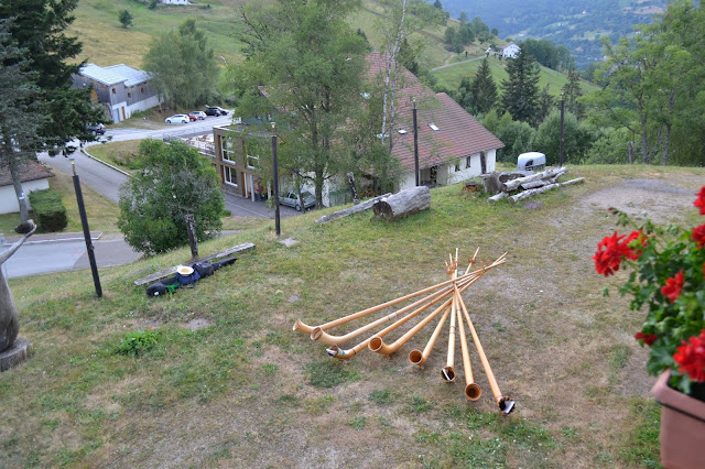 Avant de partir, une dernière séance de cors des alpes. Il pleut (enfin!), il faut alors rester sous le toit de la terrasse. Mais ce n'est pas évident avec des instruments aussi longues.